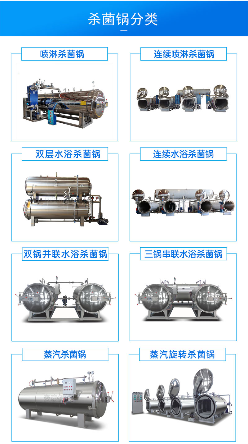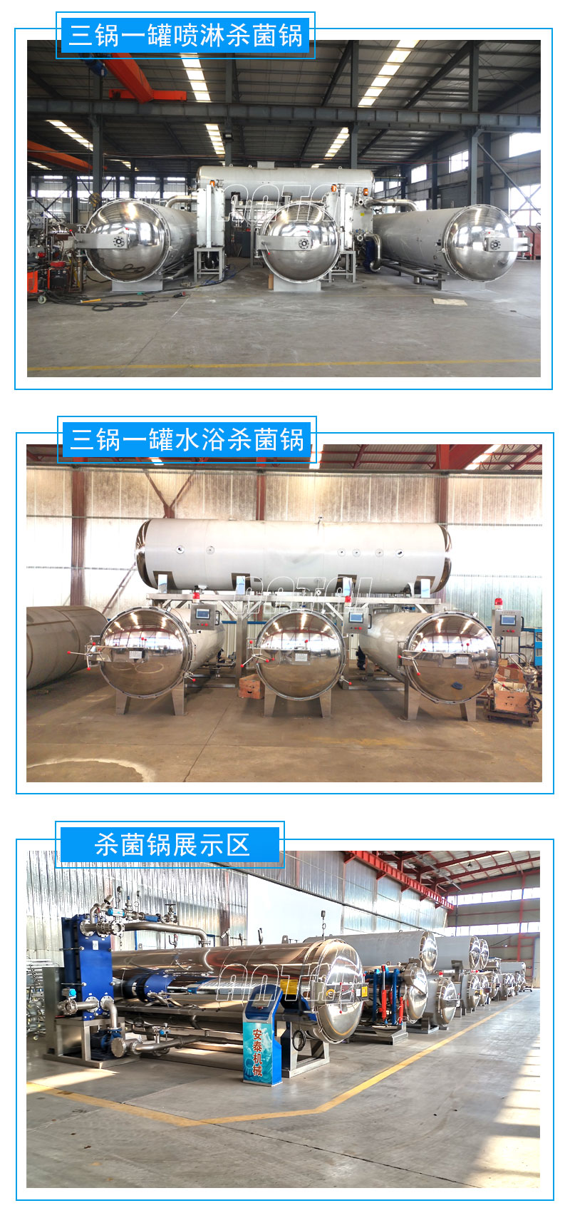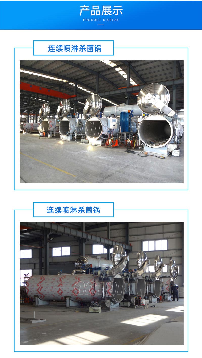 杀菌产品由输送线进入装笼机,装笼机自动将产品有序的码放进笼筐,笼筐输送线自动将满筐产品送入杀菌锅,杀菌锅根据不同的食品加工工艺调控温度和压力,热量分部均匀,压力控制平稳,每批次产品杀菌效果一致;灭菌好的产品由笼筐输送线送到卸笼机,卸笼机自动将产品从笼筐中取出,取出后的产品由输送线自动送至后包装设备进行检测及包装。