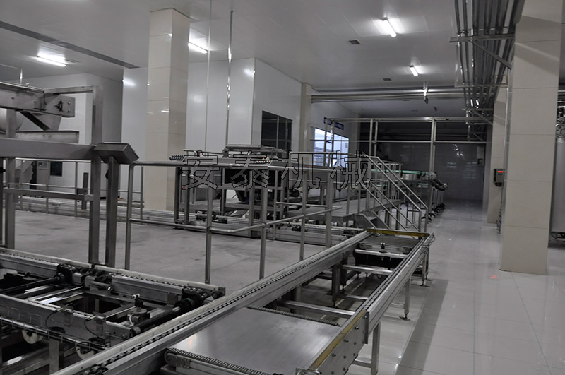 本机主要应用于对各种罐装饮料或罐头等在二次杀菌后进行自动卸笼作业。通过推罐卸出装置将堆栈于杀菌笼里的实罐,由上而下一层一层的推至输送平台上,整个卸笼过程隔层板自动取出、自动收集,罐层自动上升、自动卸罐、空笼自动停止卸罐自动下降,取代人工卸笼方式,节省人力,大大提高生产效率。